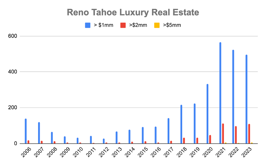 Over 500 residential transactions exceeded $1,000,000 in 2023; just the third year in which this threshold has ever been surpassed. This equated to 13% of all residential sales; the largest percentage on record. Similarly, 2023 equaled benchmark results from 2021 in the total number of transactions exceeding $2,000,000 and $5,000,000 respectively. Most notably, the first-ever residential sales to eclipse $10 million within Reno city limits was recorded in August.